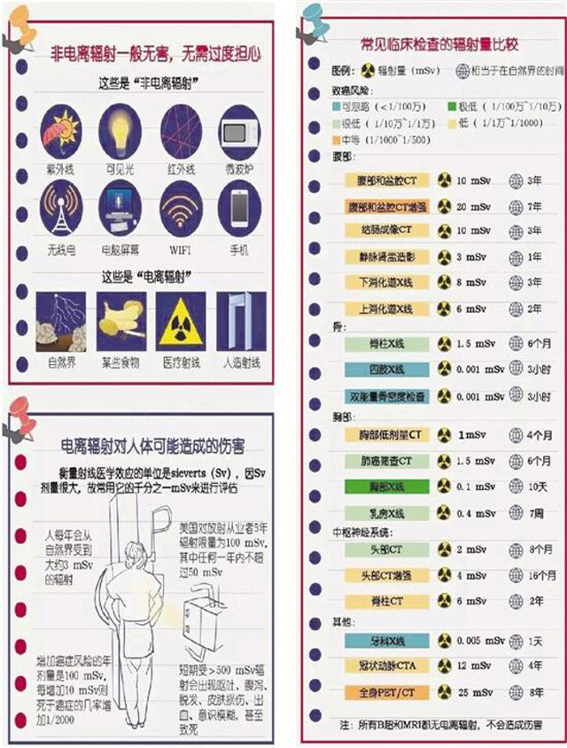 體檢車(chē)經(jīng)過(guò)幾十年的發(fā)展越來(lái)越先進(jìn),DR體檢車(chē)上面裝有車(chē)載DR設(shè)備。可以做胸部X光線檢查。一臺(tái)透視儀在體檢者胸前來(lái)回移動(dòng)照射,醫(yī)生在另一頭的檢查室觀察。體檢車(chē)放射檢查的確有利有弊是一把雙刃劍,不應(yīng)檢查過(guò)度,也不必因此諱疾忌醫(yī)。因?yàn)橥ㄟ^(guò)檢查可以更加容易對(duì)患者的病情確診,對(duì)癥下藥。放射性體檢,對(duì)身體或多或少有點(diǎn)傷害,主要的危害是放射檢查對(duì)我們是通過(guò)來(lái)自X線產(chǎn)生的電離進(jìn)行輻射。但是在必須檢查的情況下研究表明利大于弊,因?yàn)榻邮芤欢康妮椛涫钦5摹sw內(nèi)可以自我修復(fù)。一個(gè)大人接受一年100毫西弗的輻射對(duì)身體沒(méi)多大傷害的。但是不能過(guò)度放射檢查。當(dāng)有必要做的。當(dāng)數(shù)不能過(guò)于頻繁的情況或逐步改善無(wú)顯著變化,也沒(méi)有必要每天進(jìn)行審查,否則成為放療的變相。以下是常見(jiàn)臨床檢查的輻射量比較圖