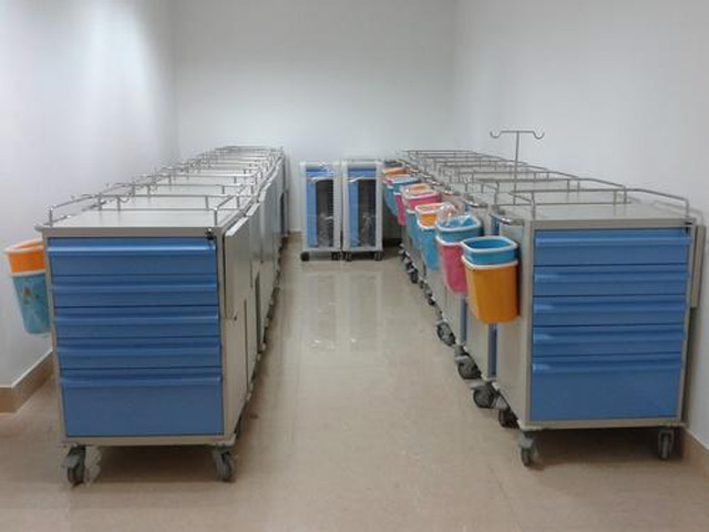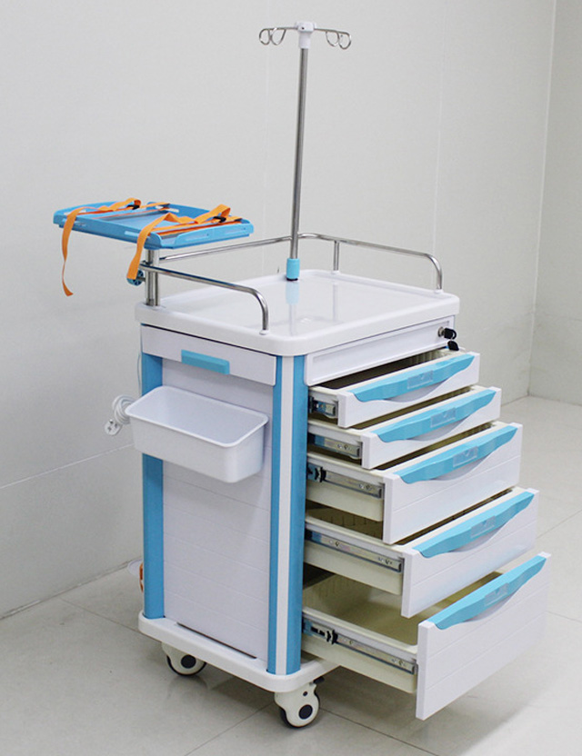 搶救車的基本構造是車體、輪子、還有醫用櫥柜。櫥柜的柜體是放藥品的空格。車體有固定氧氣瓶的套筒。還配有輸液架,還有多個放物品的抽屜。蓋板可以蓋住藥物。采用了塑鋼材料,包含工作臺面,雜物箱,輸液架,輪子,垃圾桶。一般分四個層次,急救藥品區,放置一定數量的急救藥品,根據藥品使用頻率來依次排列。輸液區,放了輸液器、注冊器、留置針、止血貼、消毒棉、砂輪、等。呼吸物品區,開口器、壓舌板、吸氧管、各種型號插管喉鏡。其他物品,溫度計、血壓計、電筒、負壓吸引器等。
